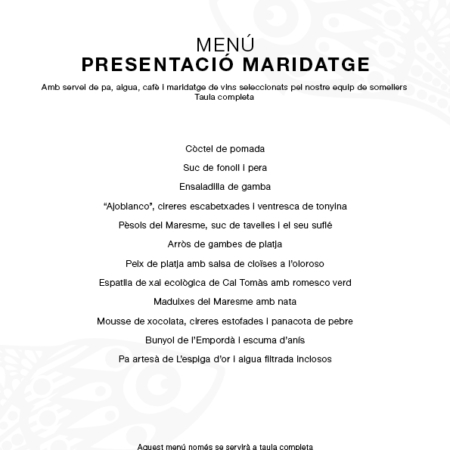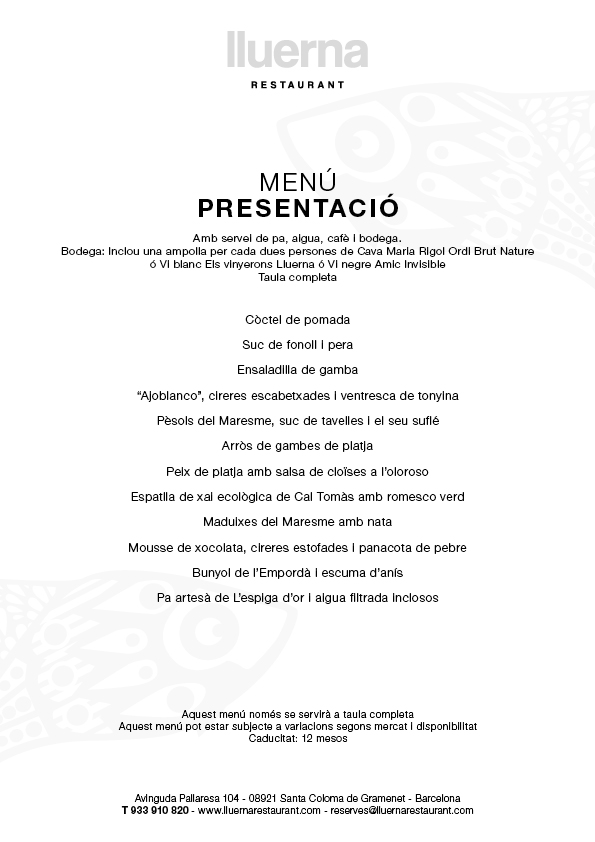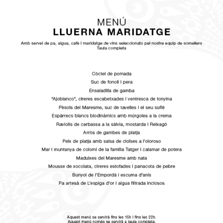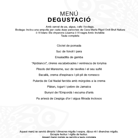 Wine cellar: Includes a bottle for every two people of Cava Maria Rigol Ordi Brut Nature or white wine Els vinyerons Lluerna or red wine Amic Invisible.