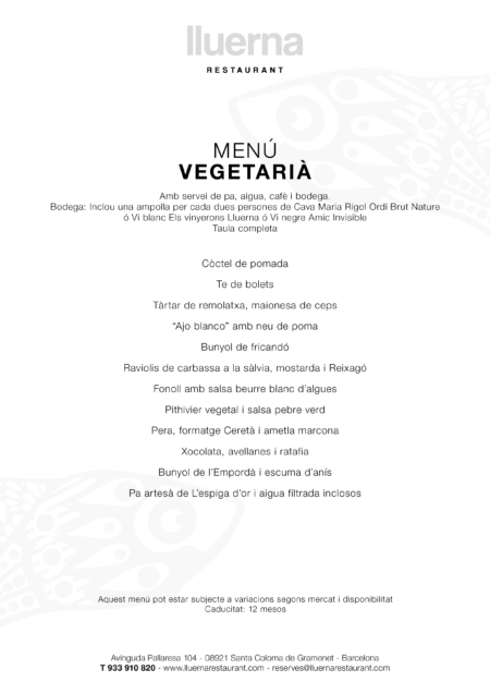 Bodega: Incluye una botella por cada dos personas de Cava Maria Rigol Ordi Brut Nature ó Vino blanco Els vinyerons Lluerna ó Vino tinto Amic Invisible