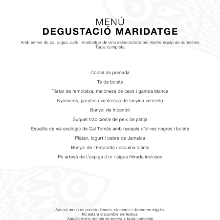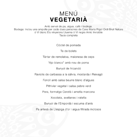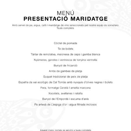 Bodega: Incluye una botella por cada dos personas de Cava Maria Rigol Ordi Brut Nature ó Vino blanco Els vinyerons Lluerna ó Vino tinto Amic Invisible
