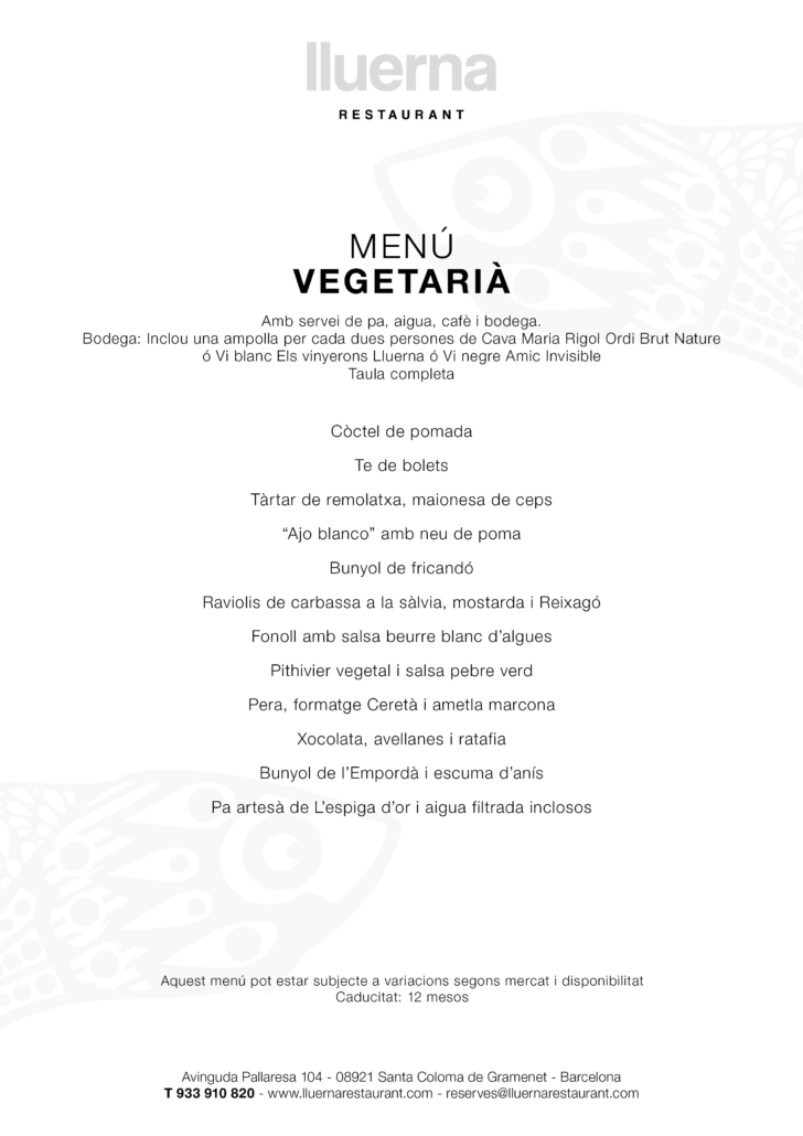 Bodega: Incluye una botella por cada dos personas de Cava Maria Rigol Ordi Brut Nature ó Vino blanco Els vinyerons Lluerna ó Vino tinto Amic Invisible