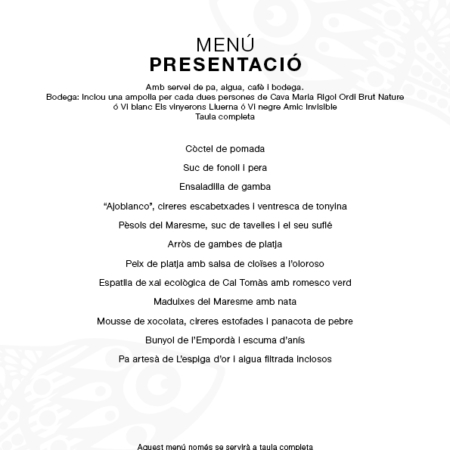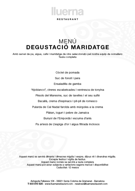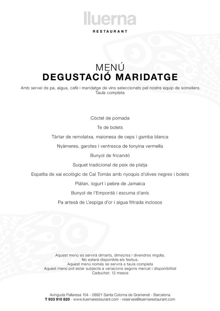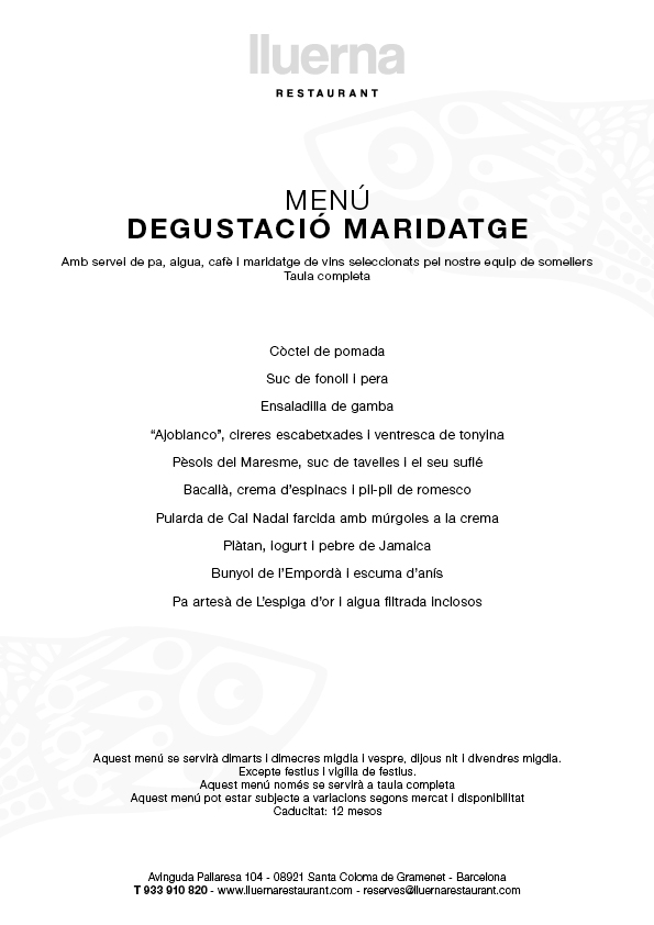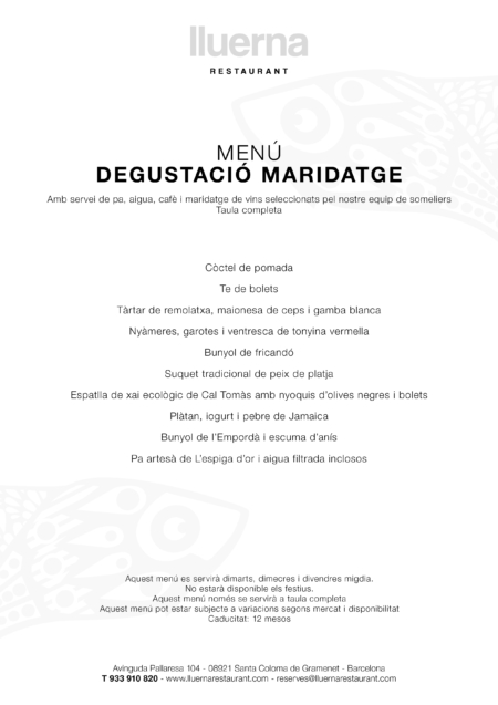 Amb servei de pa, aigua, cafè i maridatge de vins seleccionats pel nostre equip de someliers